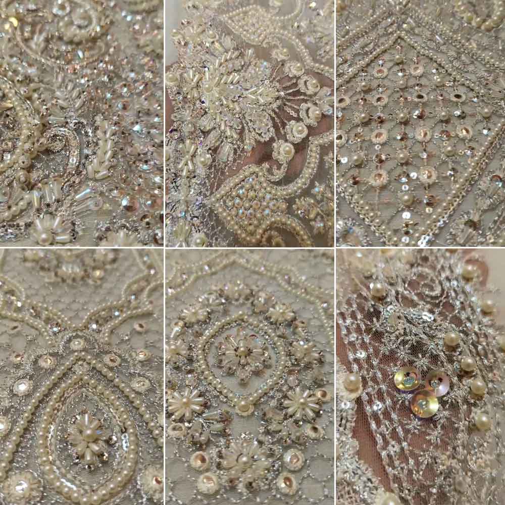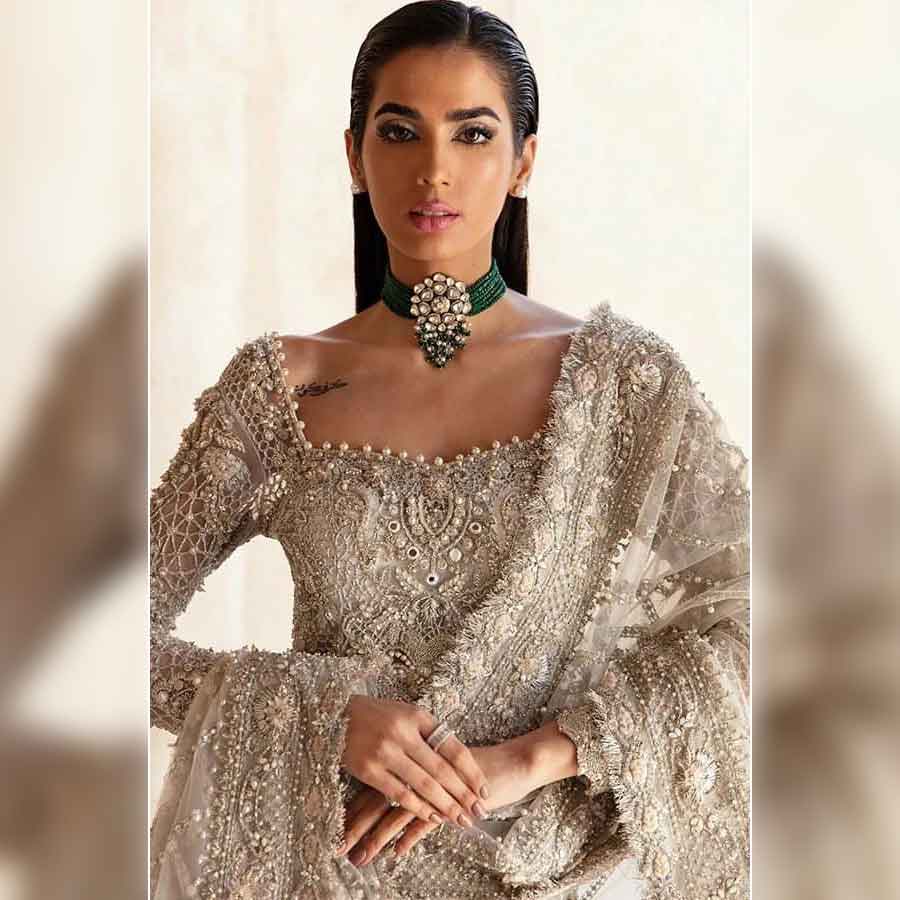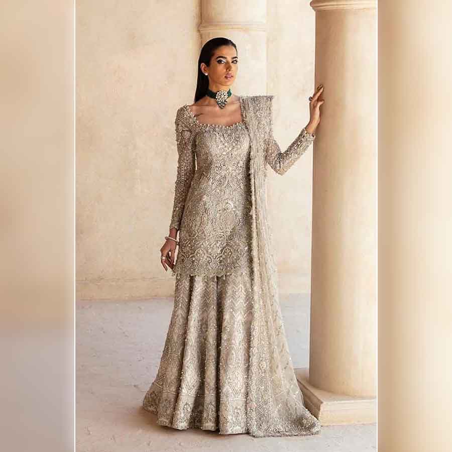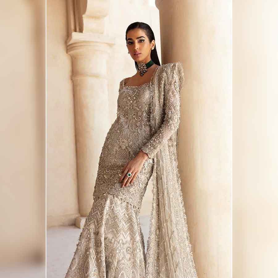 Holding a dreamy look with glorious handwork details and stunning ash-white color, opulent will surely make you feel like royalty. The net fabric drapes beautifully, while the sequenced combination of dabka, naqshi, cutdana, crystals, and pearls creates an ornate effect, that is simply breathtaking. A quintessential attire for weddings or any formal event, this dress proposes glamour and elegance.